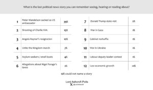 The resignations of Peter Mandelson and Angela Rayner dominated respondents’ recollections of domestic political news, followed by Tommy Robinson’s Unite the Kingdom march in London. The shooting of Charlie Kirk was the second most recalled story.