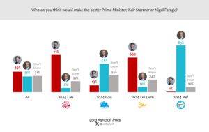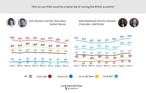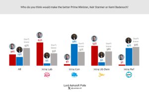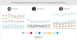Given a choice between Keir Starmer and Kemi Badenoch, voters overall say Starmer would make the better PM by a 7-point margin, though with nearly half saying “don’t know”. Those who voted Reform UK in 2024 said they preferred Badenoch to Starmer by a 44-point margin, but with half saying “don’t know”.