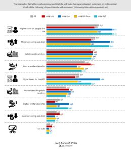 We asked whether people thought a range of things would or would not be announced in the November Budget. Top of the list, each expected by a majority of voters, were “higher taxes on people like me” (expected by more than two thirds, including 61 per cent of 2024 Labour voters), “more borrowing and debt” and “cuts in public services”. People were more likely to expect higher taxes on them personally than on “the rich”. Just under half anticipated cuts in welfare benefits. Only a quarter expected “more money for public services”.