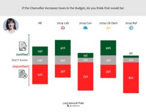 A majority of all voters, including more than one third of 2024 Labour and Lib Dem voters, said they thought tax increases in the November Budget would be unjustified. Those who switched from the Conservatives to Labour in 2024 said they would be unjustified by a 17-point margin.