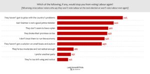 Among those who switched away from the Conservatives in 2024 and say they probably won’t return at the next election, the main reasons were “I don’t trust them on immigration”, “they don’t seem to have the answers to the country’s problems” and “they haven’t changed since they were in government”.