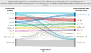 A Conservative-Reform alliance would not do much better than Reform alone. However, we can see that such an alliance would harden the Labour vote and push Labour’s ceiling above the alliance’s. The Lib Dems would see their ceiling rise in response to such an alliance, though the Greens would not.