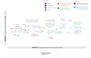 As above, our political map shows how different issues, attributes, personalities and opinions interact with one another. Each point shows where we are most likely to find people with that characteristic or opinion; the closer the plot points are to each other the more closely related they are. For example, we can see that those who feel comfortable expressing their opinion on controversial issues are most likely to be found in the more prosperous and diverse Labour-leaning top-left quadrant, while those who often feel they have to stop themselves saying what they think are most likely to appear in the less well-off, less diverse, Reform-leaning bottom right.