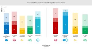 It was notable that the Con-Reform share (33 per cent) was considerably lower than the parties’ combined vote share when they were listed separately (46 per cent). Only half of those who initially said they would vote Reform UK then said they would vote for a Conservative-Reform Alliance. More than one third said they didn’t know how they would vote and 13 per cent said they would vote for another smaller party (other than Labour, the Lib Dems or Greens).