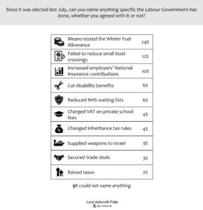 Means testing winter fuel payments continues to top the list when we ask what specific things the Labour government has done so far – indeed the top four (winter fuel, failing to stop small boats, raising employers’ National Insurance and attempting to cut disability benefits) are unchanged since last month. However, the proportion who mentioned cutting NHS waiting lists has doubled to 6 per cent.