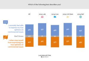 Just under half of all voters said they normally feel able to express their true opinions on controversial issues, while 42 per cent said they often stopped themselves from doing so. Those currently intending to vote Conservative and Reform were more likely to say they often stopped themselves than that they usually felt free to express their views. The youngest voters (18-24) were the most likely to say they usually felt able to express themselves, while those aged 50-64 were more likely than not to say they often stopped themselves.