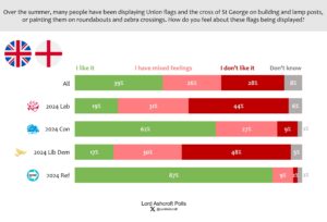 Overall, 39 per cent said they liked the flags being displayed, while 28 per cent said they didn’t like it and a further quarter said they had mixed feelings. While majorities of 2024 Conservatives and Reform UK voters said they liked the spectacle, pluralities of Labour (and Lib Dem voters said they didn’t like it, as did a majority of 2024 Green voters. Support for the flags rose by age group: fewer than half of 18-24 year-olds said they liked seeing them, compared to more than half of those aged 65 or over.