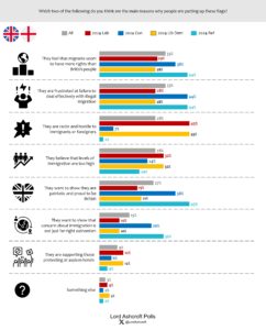 When we asked people to choose the main reasons why people had been putting up flags, the most common choices were “they feel that migrants seem to have more rights than British people” and “they are frustrated at failure to deal effectively with illegal migration”. However, among those currently intending to vote Labour, Lib Dem or Green, the most common explanation was “they are racist and hostile to immigrants or foreigners”.