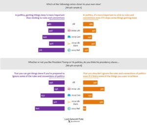 However, voters were more circumspect when President Trump was named. 43 per cent said his presidency showed you can get things done if you ignore some of the rules and conventions of politics, while 39 per cent (11 points more than in the previous question) said it showed that you shouldn’t ignore the rules and conventions of politics even if it limits some of the things you want to achieve.
