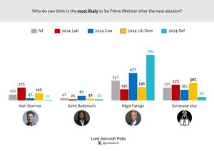 Only just over a quarter of all voters said they thought Keir Starmer would still be leader of the Labour Party in one year’s time, down from 35 per cent in August. The other leaders were all thought to be in a stronger position than two months ago: 24 per cent thought Kemi Badenoch would still be in her job (up 4 points), 42 per cent thought Ed Davey would be in his (up 5 points) and 65 per cent thought Farage would be in his (up 6 points).