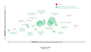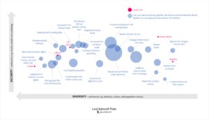 Our political map shows that winter fuel and employers’ NI were fairly universally recalled. Small boats, tax increases and the Chagos Islands deal were most likely to be mentioned in the Conservative- and Reform-leaning top and bottom right, while benefit cuts, recognition of a Palestinian state, renters’ and workers’ rights, free school meals and President Trump’s second state visit were most likely to be recalled in Labour, Lib Dem and Green territory on the left-hand side of the map.