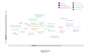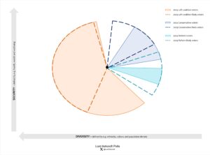 We can see that in 2024 the left coalition, comprising Labour, the Lib Dems, the SNP and Plaid Cymru, covered most of the top left quadrant, the whole of the bottom left and nearly half of the bottom right. It has now shrunk significantly no longer commands a plurality in any part of the less prosperous, less diverse bottom right. Meanwhile, the slice dominated by Reform UK has expanded into the more secure top right quadrant, with the Conservatives pushed further into that quadrant and further from the Brexit-backing bottom right which formed a crucial part of their 2019 majority.