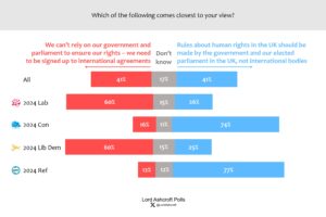 Voters overall were exactly divided as to whether rule about human rights in the UK should be made by the government and parliament, or whether we need to be signed up to international agreements to ensure our rights. Around three quarters of 2024 Conservative and Reform voters wanted rules to be made by the government and parliament; 6 in 10 Labour and Lib Dem voters, and around three quarters of Green and SNP voters wanted to be part of international agreements.