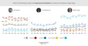 Only just over a quarter of all voters said they thought Keir Starmer would still be leader of the Labour Party in one year’s time, down from 35 per cent in August. The other leaders were all thought to be in a stronger position than two months ago: 24 per cent thought Kemi Badenoch would still be in her job (up 4 points), 42 per cent thought Ed Davey would be in his (up 5 points) and 65 per cent thought Farage would be in his (up 6 points).