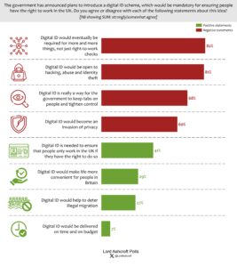 We asked how strongly people agreed with various statements about the government’s plans to introduce a digital ID scheme. Only a minority believed digital ID was needed to ensure that people only work in the UK if they have the right to do so, that it would make life more convenient, or that it would deter illegal migration, let alone that it would be delivered on time and on budget.