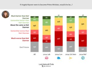 Overall, voters were more likely to think Angela Rayner would be a worse PM than Keir Starmer (33 per cent) than a better one (14 per cent). 2024 Green voters were the only group to think by a clear margin that Rayner would be better. Those currently intending to vote Labour were slightly more likely to think Rayner would be better (25 per cent) than worse (21 per cent).