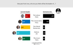 The proportion thinking Kemi Badenoch will still be in her job in a year’s time is up 10 points since we last asked the question in October, to 34 per cent. The number saying the same for Starmer is down five points to 21 per cent (including only just over one third of 2024 Labour voters), and the proportion expecting Farage still to be leading Reform is down seven points to 58 per cent. While only one third say they expect Zack Polanski still to be leading the Greens, more than half say they don’t know enough to form an opinion.