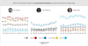 Offered a choice between Starmer, Badenoch and Farage, voters chose Starmer over Farage by an 9-point margin, with Badenoch in third place on 15 per cent. 2024 Conservative voters preferred Badenoch over Farage by a 17-point margin (up from 6 points last month), and 2024 Labour voters preferred Starmer over Farage by 64 per cent to 7 per cent.