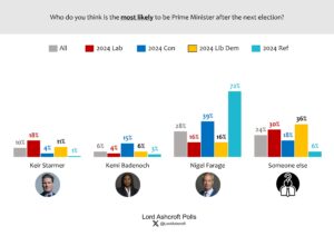 Given a choice between Starmer and Badenoch, voters overall say Starmer would make the better PM by a 2-point margin. Those who voted Reform UK in 2024 said they preferred Badenoch to Starmer by 59 per cent to 3 per cent. Given a choice between Starmer and Farage, voters as a whole chose Starmer by a 12-point margin.