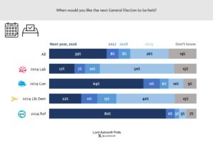 Nearly four in ten voters said they would like to see a general election in 2026, including majorities of Conservative and Reform voters. The next biggest bloc wanted to wait for the government to complete a 5-year term in 2029 – especially those currently intending to vote Labour, Lib Dem or Green.