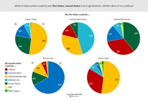 We asked respondents which party they would most like to see in government, whether alone or in coalition, and then which party would be their second choice. While two third of those who named Reform as their first-choice governing party named the Conservatives as their second choice, only 45 per cent of Conservative ‘choosers’ named Reform; one in three said the Lib Dems would be their second choice.