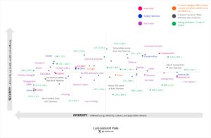 As above, our political map shows how different issues, attributes, personalities and opinions interact with one another. Each point shows where we are most likely to find people with that characteristic or opinion; the closer the plot points are to each other the more closely related they are. Here we can see the different policy priorities of different kinds of voters, their attitudes to jury trials and the potential return of Angela Rayner, and the distribution of voters who put different combinations of parties as their first and second choice.