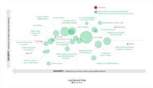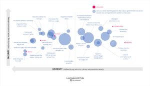 Lifting the two-child benefit cap appears close to the centre, but slightly towards Labour and Lib Dem-leaning territory. Winter fuel, tax rises, digital ID, U-turns and failures on illegal migration were more likely to be recalled in right-leaning parts of the map, while actions including raising the minimum wage, the Online Safety Act, raising defence spending and expanding free school meals were most likely to be mentioned in Labour and Lib Dem-leaning territory.