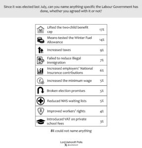For the first time, means-testing the winter fuel allowance has been toppled as the Labour government’s most recalled action. This month, lifting the two-child benefit cap tops the list, with tax rises also occupying two of the top five positions, along with failing to reduce illegal migration.