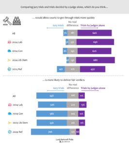 Six in ten agreed that judges sitting alone would allow courts to get through trials more quickly. However, only just over one in ten thought such trials would be more likely to deliver fair verdicts; a majority thought jury trials were more likely to do so. There was little variation between supporters of different parties.