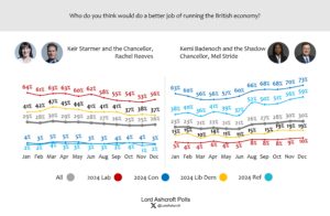 Asked who would do the better job running the economy, voters chose Kemi Badenoch and Mel Stride over Keir Starmer and Rachel Reeves by a 4-point margin, with 44 per cent saying “don’t know”. Only just over half of 2024 Labour voters named the Labour team; nearly three quarters of 2024 Conservatives chose the Tory team.