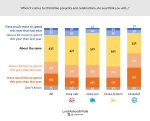 In a deceptively festive but in fact strategically critical question, we found that Keir Starmer was thought the leader most likely to make a boring speech at a Christmas party, sneak off from a Christmas get-together to do some work, and watch the King’s Christmas broadcast live at 3pm on Christmas Day.
