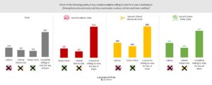 To find out, we asked one further question: whether there were any parties that people would be unwilling to support, even as a tactical vote. Here we begin to see the dents in left-of-centre solidarity. Just over half of Green and Lib Dem supporters, and just under two thirds of Labour supporters, say they would be prepared to vote for any of the others. But a quarter of Lib Dems and three in ten Greens say they wouldn’t vote Labour; a fifth of Greens wouldn’t vote Lib Dem; and almost as many Labour supporters say they wouldn’t vote Green.