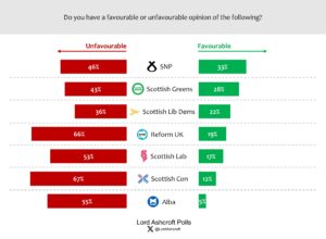 Just over half of Scots (including around three quarters of likely SNP and Labour voters) said they thought Reform UK were a negative influence on politics and they wished the party didn’t exist. A further 17 per cent, including one third of likely Conservative voters and more than one in five likely Lib Dems, say they probably wouldn’t vote Reform but they say things that need to be said so they’re glad the party is around. Just under one in five, including half of all 2021 Conservative voters, say they like a lot of what the party stands for and could see themselves voting for it in an election.