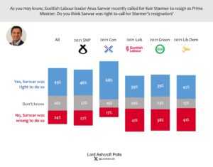 By a margin two-to-one margin, Scots thought Scottish Labour leader Anas Sarwar was right to call for Keir Starmer to resign as prime minister (indeed those intending to vote for Scottish Labour in the Holyrood elections were the only group to disagree). However, a majority of all parties’ voters thought Sarwar had made the call as a tactical move to distance Scottish Labour from the Starmer government, rather than that he was saying what he believed was right.