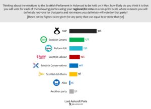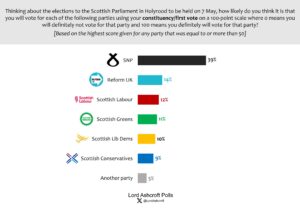 We asked people how likely they thought they were to vote for each party in the Scottish Parliament elections in May on a scale from 0 to 100 – where 0 means there is no chance they will vote for that party and 100 means they will definitely vote for that party. Looking at those saying they are more likely than not to vote for one party (those whose likelihood of voting for one party was at least 50/100), this implies the following state of the parties in the constituency and regional list votes at the outset of the campaign: