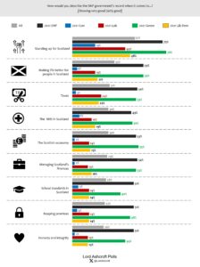 for the party this year. On other things, the proportion saying the SNP government had done a good job did not exceed 35 per cent (“making life better for people in Scotland”) and fell to as low as 26 per cent for “honesty and integrity” – though majorities of both 2021 and likely 2026 SNP voters said the Scottish government had performed well on this score.