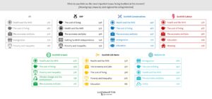 Asked to name the three most important issues facing Scotland at the moment, Scots as a whole chose health and the NHS, the cost of living, and the economy and jobs as their top three priorities. These were followed by immigration, poverty and inequality, housing, education and climate change. However, there were notable differences between political groups. Health and the cost of living topped the list for those intending to vote SNP, Labour, Conservative and Green in the regional list vote. For the first three of these the economy was in third place, but for Greens this spot went to poverty and inequality.