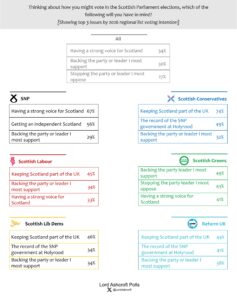 Asked what they would have in mind when deciding how to vote in the Holyrood elections, Scots were most likely to choose having a strong voice for Scotland, followed by backing the party they most support or stopping the party they most oppose. Only 26% overall mentioned the record of the SNP government, putting it in fourth place.