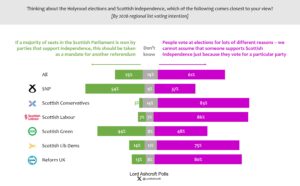 Only a quarter of Scots overall – including only just over half of likely SNP voters – said that pro-independence parties winning a majority of seats in the May election should be taken as a mandate for another independence referendum. More than six in ten agreed with the alternative proposition that someone cannot be assumed to support independence just because they support a particular party. Those intending to vote Green chose the second statement by a four-point margin.